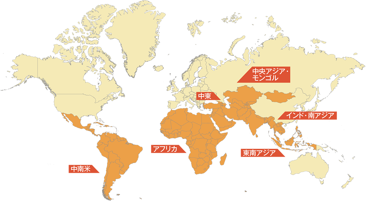 ここでは、商社によるグローバルサウスとの具体的取り組み事例を、「東南アジア」「インド・南アジア」「中央アジア・モンゴル」「中東」「アフリカ」「中南米」の6地域に分けてご紹介します。