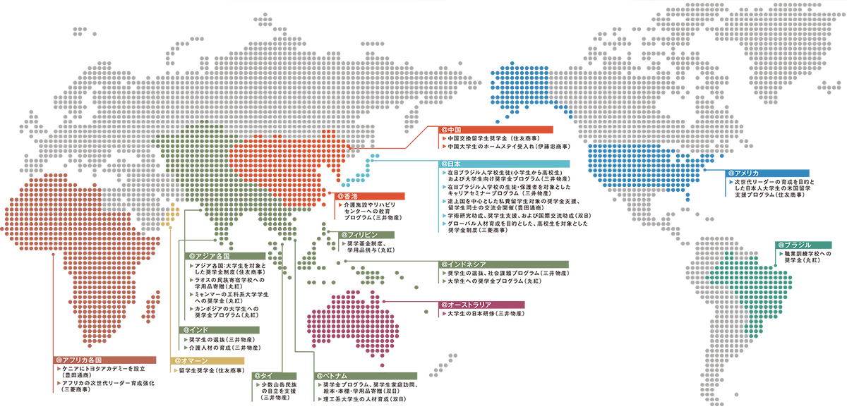グローバルサウス諸国などいまだ経済格差の大きい地域を中心に、商社はグローバルな拠点網を活かしてそれぞれの地域の事情に合わせた教育支援を行っています。奨学金や学用品の寄付、人材育成プログラムの提供等を通じて、産業の持続的成長を支えるための人材育成や、各社の事業推進を支える地域社会の発展に貢献しています。
